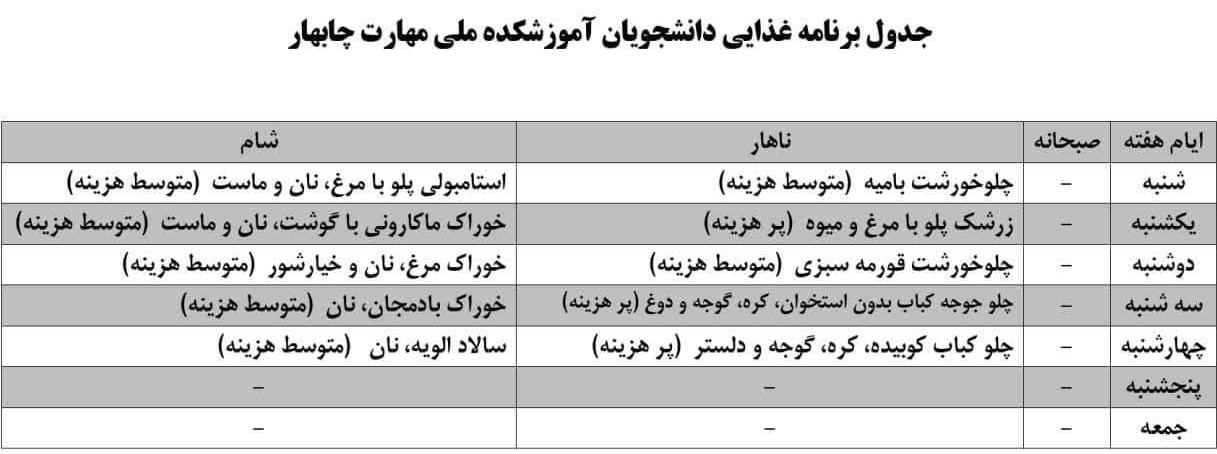 به اطلاع کلیه دانشجویان عزیز آموزشکده ملی مهارت پسرانه چابهار می رساند جهت رزرو غذا طبق جدول پیوست به دفتر آموزشکده مراجعه نمایند.