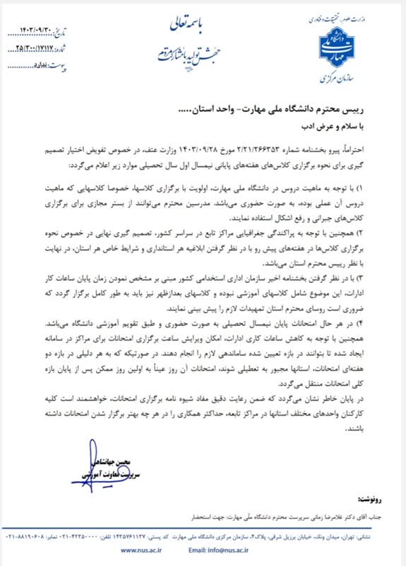 بخشنامه دانشگاه ملی مهارت کشور در رابطه با برگزاری کلاسهای هفته های پایانی نیمسال اول صادر گردید.